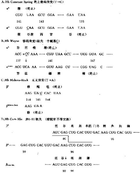 ③终止密码突变:例如Hb Constant Spring就是由于α珠蛋白基因第142位终止密码子TAA(mtRNA为UAA)突变为CAA(谷氨酰胺),结果α延长为172个氨基酸,这种突变基因转形成的mRNAI不稳定,所以导致α链合成减少,表现为α+地中海贫血。
