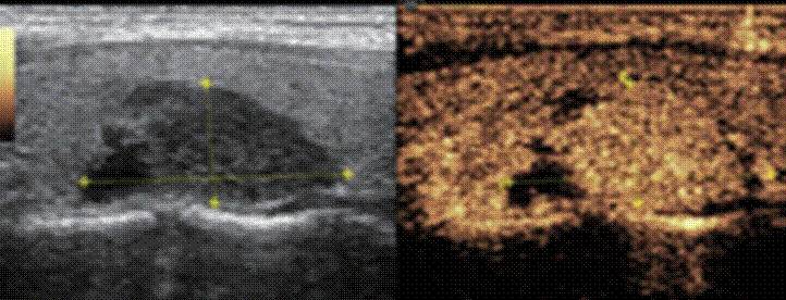 甲状腺实性结节超声造影为明显高增强 大小约4.4cmx2.6cmx2.7cm