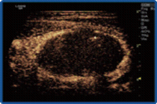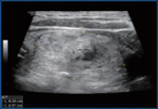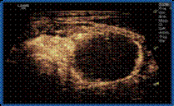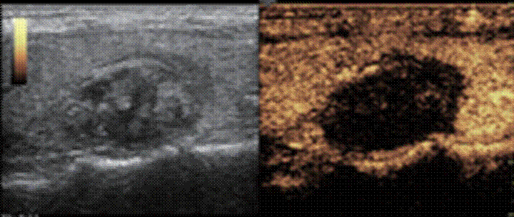 消融治疗后超声造影患者甲状腺结节完全无增强,呈坏死改变