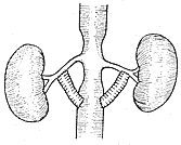 6.肾动脉再植术 适用于肾动脉开口异常或肾动脉开口水平的腹主动脉内有斑块硬化病变,切断肾动脉后将远端再植于附近正常的腹主动脉。