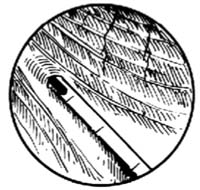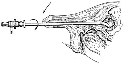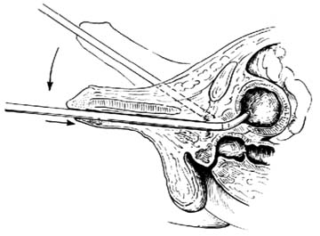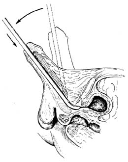 2.插入膀胱镜 男性病人在插膀胱镜前,探查尿道是否正常或有无狭窄,然后换用窥镜慢慢沿尿道前壁推至尿道膜部,遇有阻力时,可稍待片刻,等尿道括约肌松弛即能顺利进入膀胱。插入时切忌使用暴力,以免损伤尿道,形成假道[图2]。女性病人容易插入,但应注意窥镜不得插入过深,以免损伤膀胱。如所有为凹型镜鞘,需将膀胱镜旋转180°[图3]。