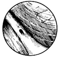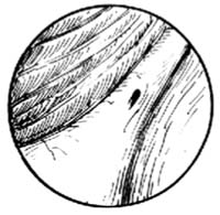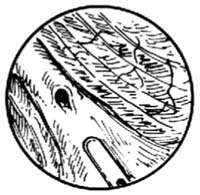 3.检查膀胱、输尿管插管 窥镜插入膀胱后,将镜芯抽出,测定残余尿量。如尿液混浊(严重血尿、脓尿或乳糜尿),应反复冲洗至回液清晰后,换入检查窥镜。将生理盐水灌入膀胱,使其逐渐充盈,以不引起病人有膀胱胀感为度(一般约为300ml)。将窥镜缓慢向外抽出,看到膀胱颈缘为止。在膀胱颈缘的两下角处将窥镜推入2~3cm,即可看到输尿管间嵴。在时钟5点到7点的方位、输尿管间嵴的两端,可找到两侧输尿管口[图4]。如细心观察,可见管口有蠕动排尿、排血或排乳糜现象。最后,应系统、全面、由深至浅地检查全部膀胱,以免遗漏。