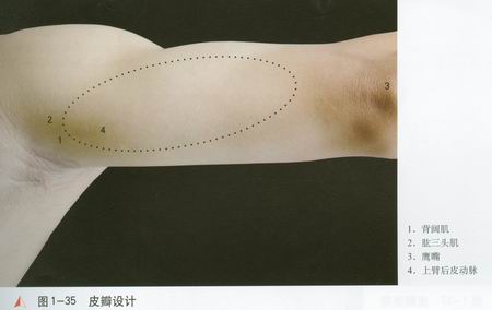 影,以此线为轴设计一梭形皮瓣,背阔肌与肱三头肌交角外2cm处为皮瓣血管的浅出点。
