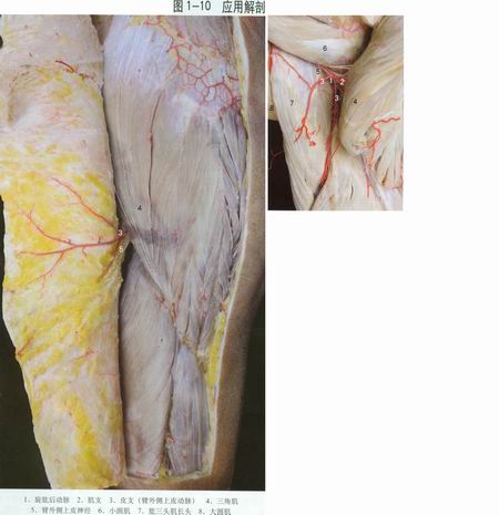 旋肱后动脉是腋动脉发出的分支,穿过四边间隙到达三角肌深面时,本干的外径平均3.8mm。在四边间隙后方,分出许多较粗大的肌支[2]和1—2支较细小的皮支[3],前者伴随腋神经的肌支进入三角肌[4],后者(即臂外侧上皮动脉)伴随腋神经的臂外侧上皮神经[5]出三角肌的后下缘(该处动脉外径为0.8—1.Omm),分布至臂外侧上部皮区,其血管蒂长约5cm。