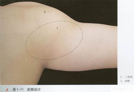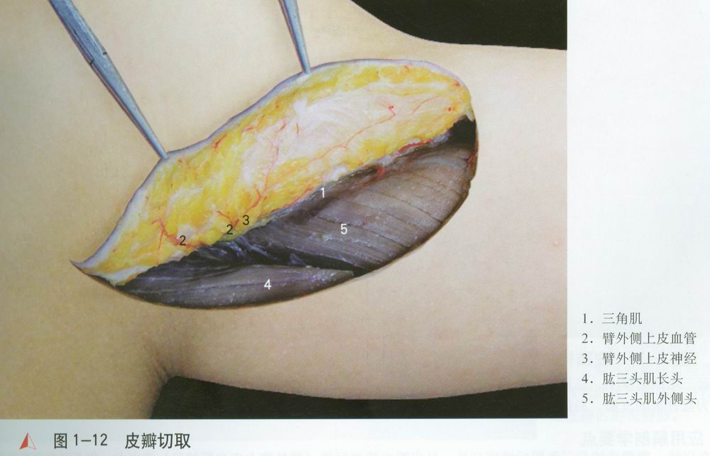 按设计作皮瓣后缘切口,在深筋膜下向前掀起皮办,直至三角肌后缘[1],注意勿损伤