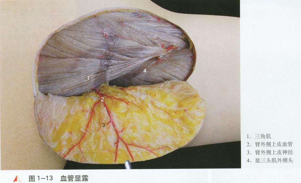 从三角肌后缘浅出的臂外侧上皮血管[2]和臂外侧上皮神经[3]。