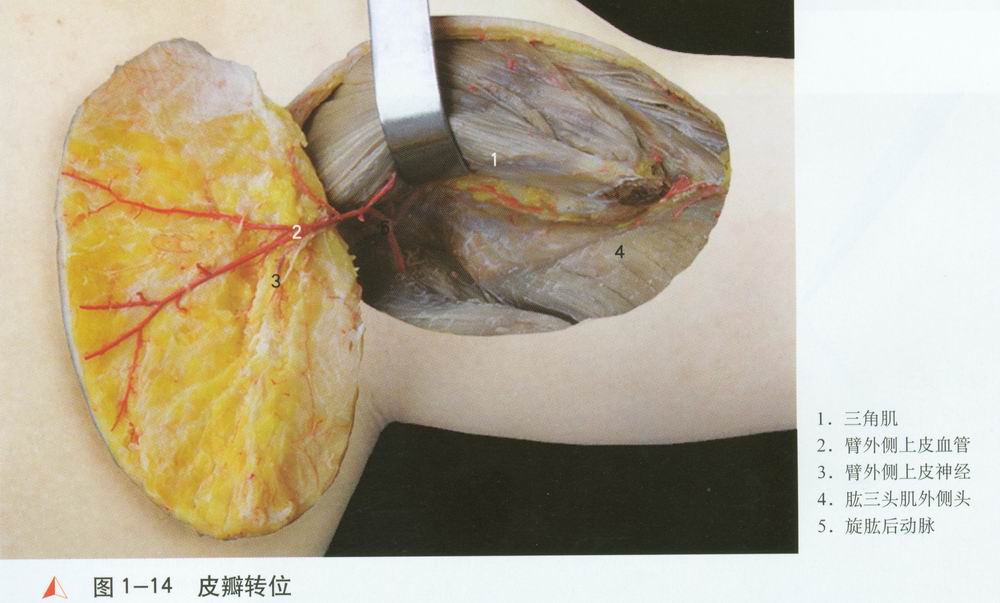 该皮瓣位于上臂外侧上部,其轴心血管由旋肱后动脉——臂外侧上皮动脉组成,皮瓣质量较好,部位较前臂隐蔽,可携带皮神经,用于上臂近端,肩、腋部的皮肤缺损的修复,也可行游离移植。