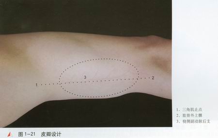 在上臂外侧面,从三角肌止点[1]至肱骨外上髁[2]画一连线,该线为臂外侧肌间隔和桡侧副动脉后支[3]的表面投影。以该线为轴设计皮瓣。皮瓣的上界可达三角肌止点上方5cm,外界至上臂后侧中线,内界至上臂前面内侧缘,下界至肘横纹。