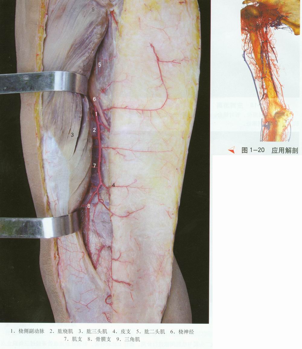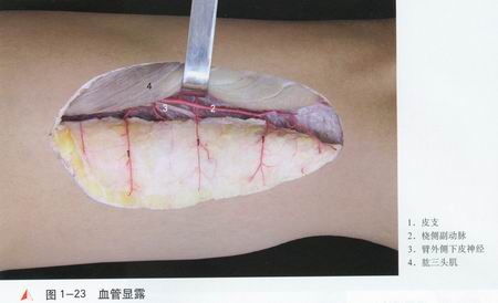 桡侧副动脉[1]在三角肌止点平面起于肱深动脉,在止点下4cm处分为前后两支。前支与桡神经伴行,穿过臂外侧肌间隔,行于肱肌和肱桡肌之间,位置较深,与皮瓣血供关系不大;后支贴附臂外侧肌间隔后方,在肱桡肌[2]与肱三头肌[3]之间下行,逐渐浅出,至肘后外侧沟,与桡侧返动脉吻合,参与肘关节动脉网,沿途发出l—6个皮支[4],分布于上臂外侧下部皮肤。动脉有静脉及皮神经伴行,皮神经有较细小的上部分支(臂外侧下皮神经,横径约2.0mm)和较粗大的下部分支(前臂后皮神经,横径约2.5mm)。桡侧副动脉外径约1.3mm。静脉有动脉伴行的深组桡侧副静脉和浅组的头静脉。