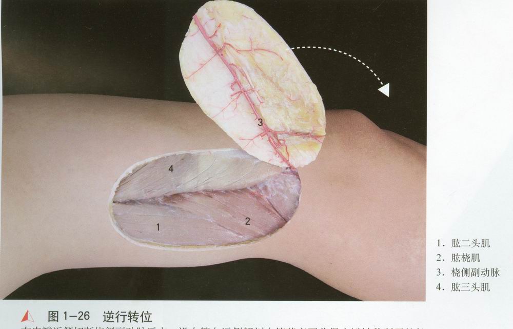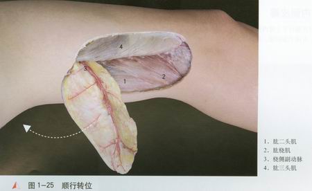 度。以桡侧副动脉[3]为血管蒂的臂外侧皮瓣逆行向远侧转移修复肘部创面。