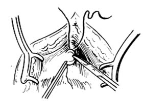 6.缝尿道前缘 以0号铬制肠线缝合切开的尿道切口上缘,以后有助于膀胱颈和尿道的吻合。