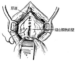 13.留置气囊导尿管 经尿道放一气囊导尿管,引入膀胱腔,气囊充气,牵引导尿管,将膀胱拉向尿道,然后结扎留置的缝合肠线,并缝合膀胱前壁[图1