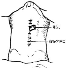 15.缝合 膀胱周围区放香烟引流,逐层缝合切口[图1 ⑽]。