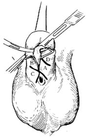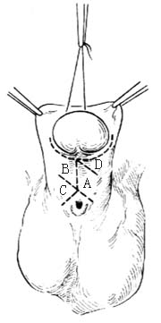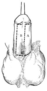 2.切口 于阴茎腹侧中线两旁做两条平行切口,间距1.5~2.0cm,上端距冠状沟0.5cm,下端达尿道口下方0.5cm。每条切口的上、下两端各做一同向的横切口,上端的两个横切口不连接,间距在0.5cm以上,下端的两个横切口绕过尿道口下方相连接,从而形成A、B两个皮瓣[图2