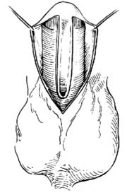 2.切口 于阴茎腹侧中线两旁做两条平行切口,间距1.0~2.0cm,上端起自冠状沟,下端绕过尿道口下方0.5cm后相互连接。为使尿道口达到阴茎头,可将阴茎头两侧各切除一块三角形组织,形成创面[图3