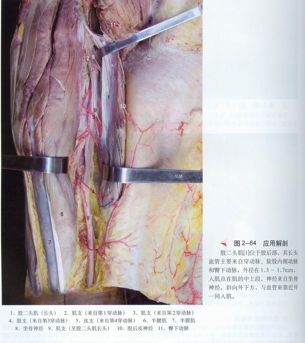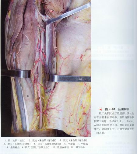 ①股二头肌长头主要血管在肌的中份深面入肌,可在股后肌群中点处沿中线切开,在肌前缘即可找到来自第1穿动