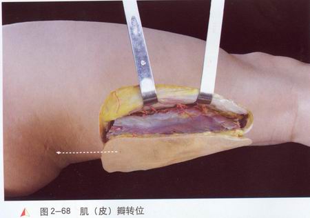 瓣部分覆盖创面。若受区创面大,可在远端切断股二头肌长头,以增加推进距离,最后呈