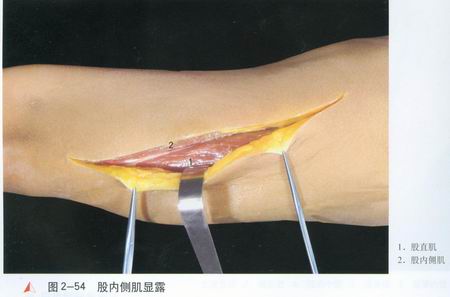 按设计先作皮瓣外侧切门,切开深筋膜,辨清股直肌[1]与股内侧肌[2]间隙。