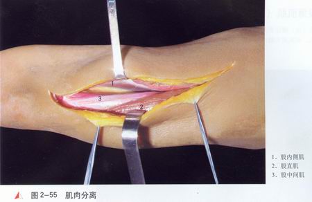 钝性分离肌间隙,并沿股内侧肌深面继续分离股内侧肌[1]与股中间肌[3]间隙,木中注