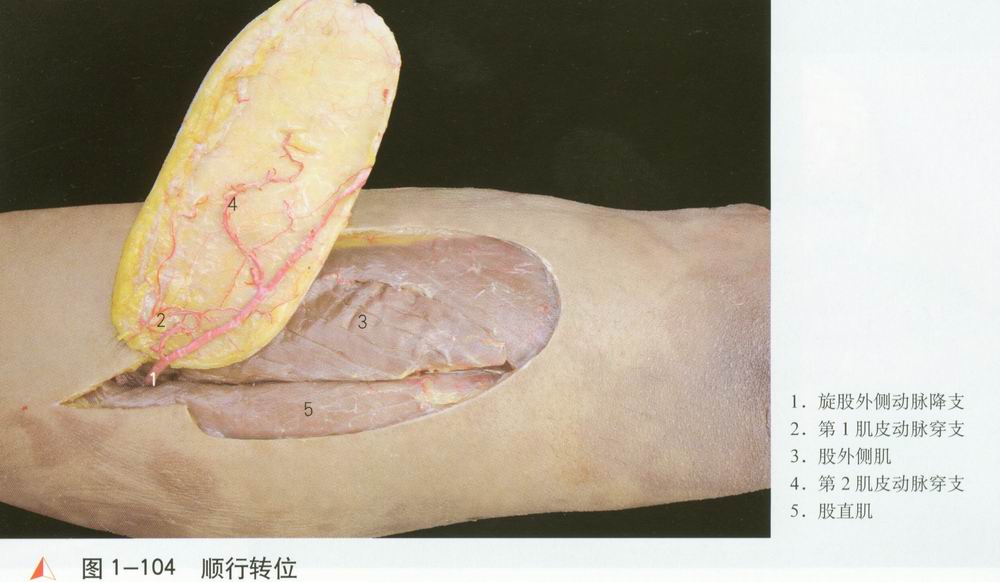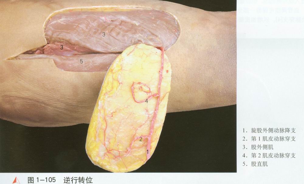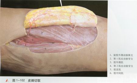 股前外侧皮办位于大腿前外侧,以旋股外侧动脉降支及其肌皮动脉穿支为血管蒂。血管解剖恒定,蒂长径粗,皮瓣切取面积大。局部转移可修复大转子、会阴部以及腹股沟创面。血管远侧与膝外上动脉相吻合,可形成以膝外上动脉为蒂的逆行岛状皮办,用以修复膝关节周围缺损。