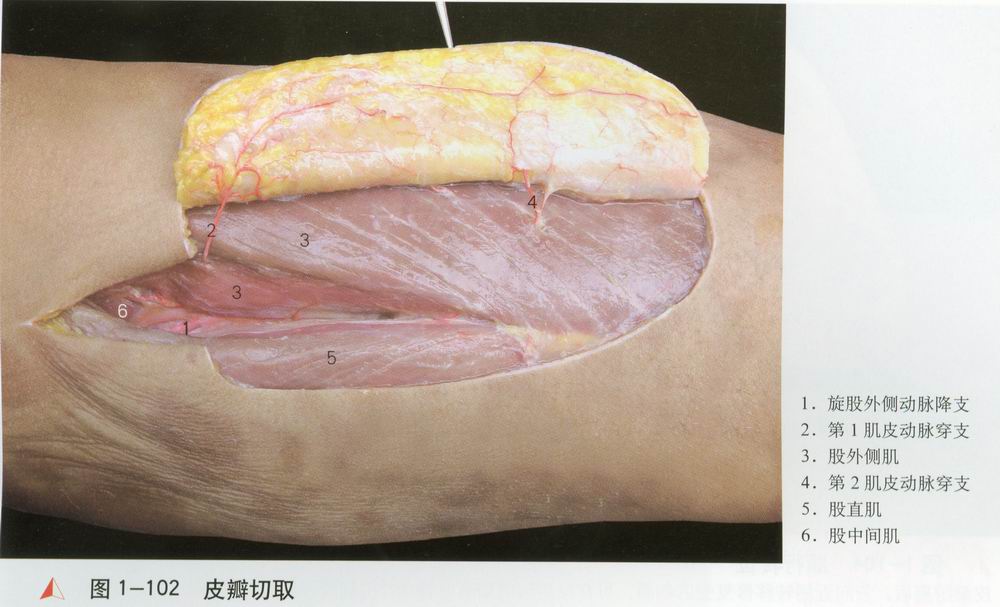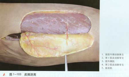 旋股外侧动脉降支[1]在股直肌[2]与股中间肌[3]之间行向外下方,在股外侧肌[4]与股直肌之间分为内侧支[5]和外侧支[6]外侧支沿股外侧肌与股直肌之间向外行,沿途发出分支穿过股外侧肌或肌间隙,至股前外侧皮肤。多数为肌皮穿支,少数为肌间隙皮支。第1肌皮动脉穿支[7]最为粗大,外径0.5—1.0mm,是皮瓣的主要血管。内侧支继续下行沿途分支供养邻近肌肉,最后与膝外上动脉相吻合参与膝关节网的组成。