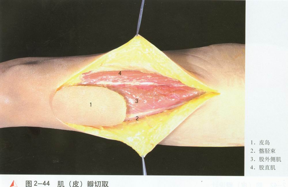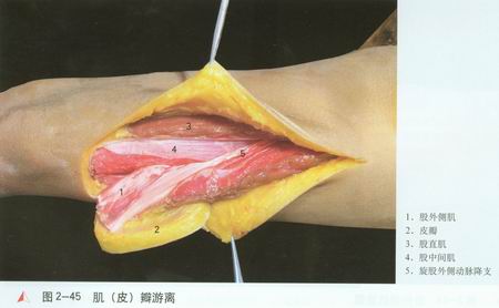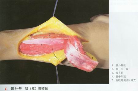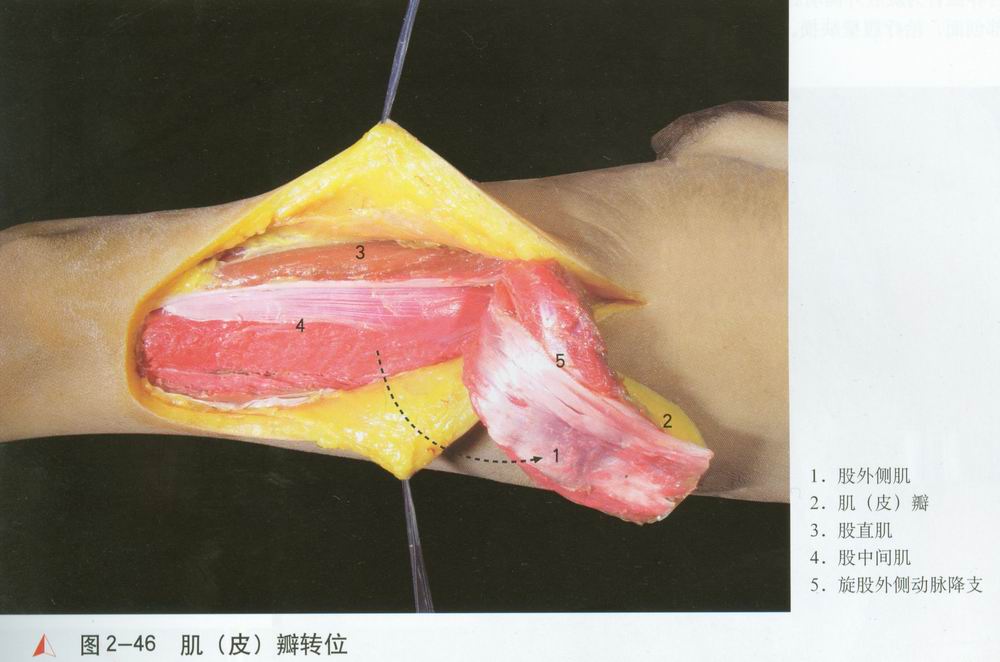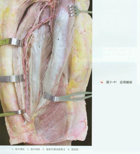 股外侧肌[1]是股四头肌的一部分,该肌上2/3与深面的股中间肌[2]有较明显的界线,但肌下1/3与股中间肌粘附较紧不易分开。肌肉血供来自旋股外侧动脉降支[3],经股直肌[4]深面沿股外侧肌前缘下降,入肌点约在大转子下方10cm处,(相当于股外侧肌中上1/3稍上方),肌外血管蒂长约6cm。股外侧肌上部浅层因有股直肌和阔筋膜张肌相间隔,无直接肌皮支进入皮肤,不能形成肌(皮)瓣。但在大腿下部股外侧肌有肌皮支直接进入皮下组织和皮肤,并与股直肌和阔筋膜张肌来的肌皮支广泛吻合,使该肌远端可携带一个岛状皮瓣。
