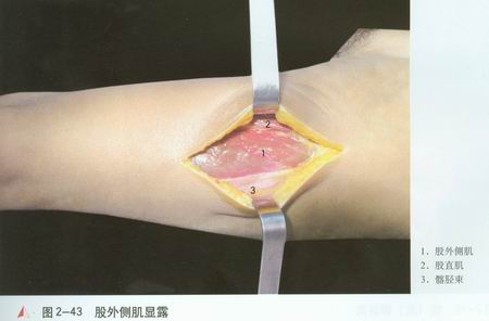 先作皮瓣近侧缘切口线,显露股外侧肌[1],辨清与股直肌[2]和阔筋膜张肌毗邻关系。