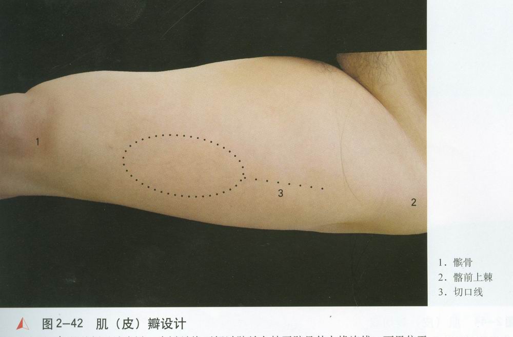在大腿下1/4部外侧设计皮瓣,皮瓣前缘不超过髂前上棘至髌骨外上缘连线,下界位于