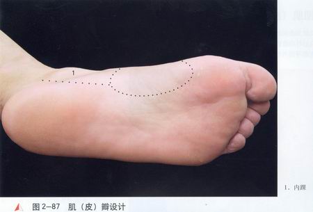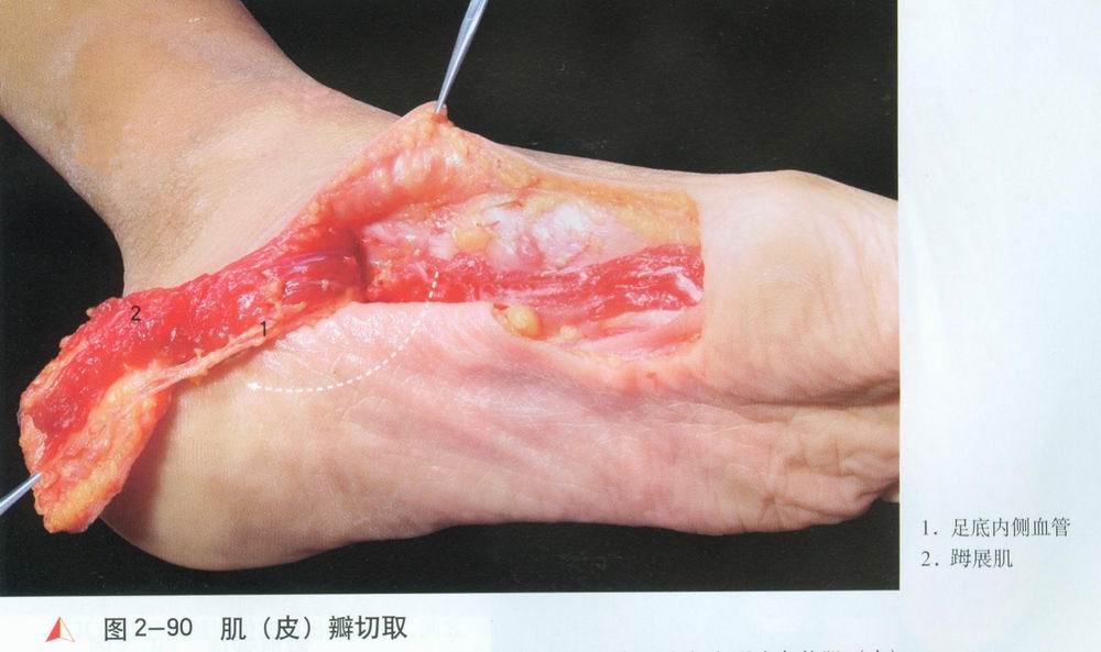 性劈开,可切取更长的神经蒂;③肌(皮)瓣设计时,切取足底内侧非负重区皮肤,皮办范围可大丁肌瓣。