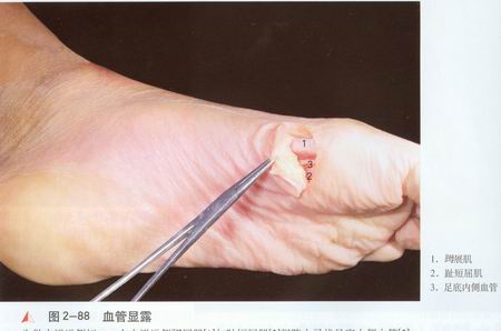 先做皮瓣远侧切口,在皮瓣远侧母展肌[1]与趾短屈肌[2]可隙内寻找足底内侧血管[3]