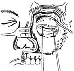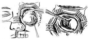 上颌窦癌向上发展,穿破眼眶底壁并且眶骨膜已受肿瘤侵蚀者,除应将上颌骨截除以外,尚须同时作眶内容剜除术。