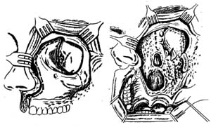 | 图5 上颌骨截除线路(左图)和取出眶内容与上颌骨以后的术腔(右图) |