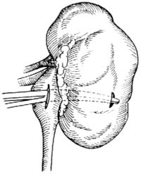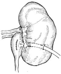 如果肾皮质比较厚,则可先在肾盂后面作一纵形切口,伸入一弯止血钳,从肾下极偏后侧向外穿出肾实质,夹住蕈状导尿管将其引入肾盂内。