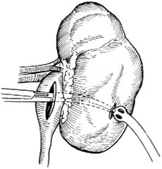 2.插管引流 在皮质较薄的部位切开肾实质。切口宜小,只要能通过一把止血钳,将蕈状导尿管插入肾盂即可进行引流。