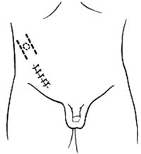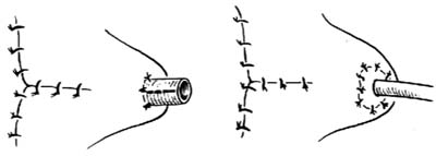 | ⑵输尿管从腹壁皮瓣中央穿出、固定 |