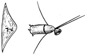 ⑴]。此时,将皮瓣中点向前拉起,把两端相对缝合。