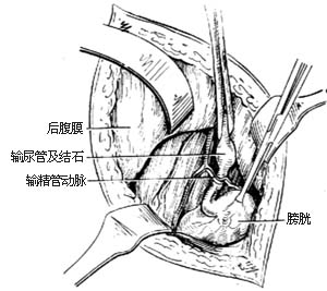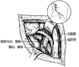 ⑶显露输尿管:进入腹膜后间隙之后,可见输尿管位于腹膜后的腰大肌之前,精索内动、静脉(或卵巢动、静脉)横越输尿管,应加保护,避免损伤。