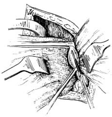 ⑵切开肌层:切开腹外斜肌、腹内斜肌及腹横肌。在切断腹横肌时,注意避免损伤肋下神经、血管、髂腹下神经和髂腹股沟神经。