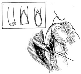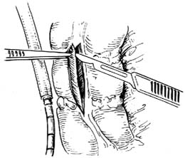 4.形成结肠带隧道 选择部位合适的乙状结肠段,在其上选择合适的结肠带作一长3~4cm的纵行切口,切开浆膜及肌层,在粘膜下层向两旁潜行分离各约1~1.5cm,使成一隧道[图1