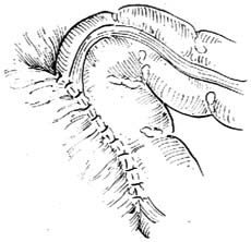 6.吻合输尿管乙状结肠 在乙状结肠浆肌层的最下端将粘膜切一小口,与输尿管端椭圆形断面等大,将两处切口对齐,作端侧吻合,先用4-0铬制肠线将输尿管全层和肠壁粘膜层边缘的上下两角各缝一针,再作间断缝合约8~10针[图1