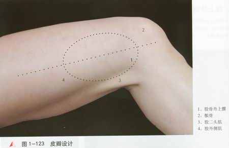 屈膝位,大腿外侧正中为轴心线,股骨外上髁[1]以近4cm处为皮支入皮点,髌骨[2]外侧缘向近端延长线为皮瓣的前缘,股二头肌[3]后缘为皮瓣后缘,下界为髌骨上缘水平线,据