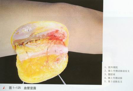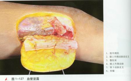 膝上外侧动脉[1]在股骨外上髁[2]上方2.8cm处起于胭动脉[3],沿股骨后侧水平向外走行,在穿外侧肌间隔时紧贴骨膜分为上、中、下骨膜支[4—6]及前、后、远皮支[7—9]。骨膜支发出多支分支分布于股骨远端前外侧,彼此吻合成网,并与膝最上外动脉及膝降动脉的骨膜支构成吻合网[10],可提供骨瓣面积达8.6cmX 5.4cm。前皮支向前外上行走,穿髂胫束进入股骨远段外侧皮肤,后支在外侧肌间隔后缘向外行走,进入股骨下段外后侧皮肤,远侧支自膝上外侧动脉发出后即在外侧肌间隔后缘向远端行走,穿经髂胫束进入股骨下端外侧皮肤,并发交通支与膝周血管网吻合。皮支同时有丰富的血管网供应髂胫束[11],可提供皮瓣面积达17.5cm X ll.Ocm。膝上外侧动脉起始处外径2.1mm,主干长2.5cm。