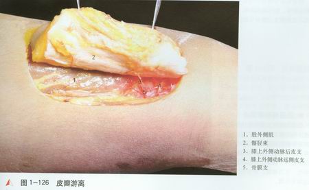 先做皮瓣前缘切口,在深筋膜下沿股外侧肌[1]表面向外钝性分离即可见到前支[2]入皮。