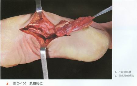 以足底外侧动脉为血供的小趾展肌,位于足底外侧。由于足的外侧缘参与负重,使该肌仅作为肌瓣使用,用于修复