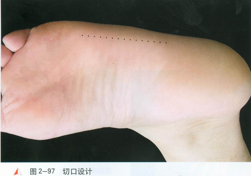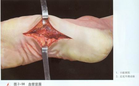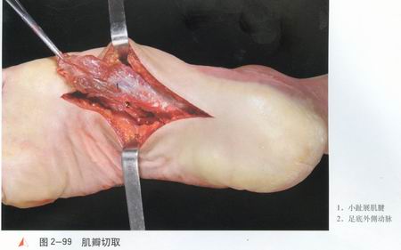 切开皮肤,显露小趾展肌[1],注意勿伤位于肌肉内侧的足底外侧动脉[2]。