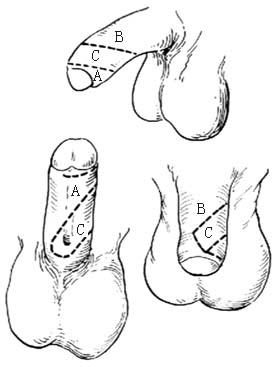 2.切口 于阴茎腹侧围绕尿道口做两条平行斜切口,间距约为阴茎周径的1/3,两切口斜向阴茎背侧直达冠状沟,可略超过背侧中线。然后连接在一起,此为形成皮管的皮瓣C[图1