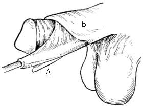 3.阴茎伸直、尿道成形 首先沿冠状沟做一附加切口,使成皮瓣A。将A瓣掀起,显露阴茎腹侧中央的纤维束带,予以彻底切除,充分伸直阴茎。然后自尿道口置入导尿管,将C瓣周缘稍事分离后包绕导尿管,形成创面朝外的管状,用5-0尼龙线或丝线间断缝合,线结打在管道内面,令其术后自行脱落[图1