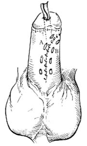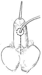 2.术终,将整个阴茎阴囊部行弹性加压包扎,包扎一定要牢靠,此系防止术后水肿的重要措施。