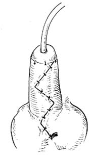 ⑵]。于阴茎头做一隧道,将已制成的管道远端埋入隧道内,管道外口与阴茎头创缘缝合固定。如此形成的尿道虽略有弯曲,但不影响尿流通畅。