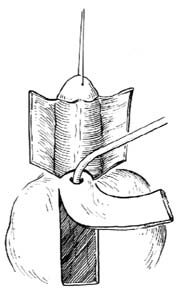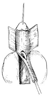 2.切口 先于尿道口内留置导尿管以支撑。然后切取以尿道口周缘5mm为蒂的沿阴囊中线向根部延伸的舌形皮瓣,宽2cm,长度要比尿道口至阴茎头顶端的距离长出1~2cm,厚度包括肉膜层。